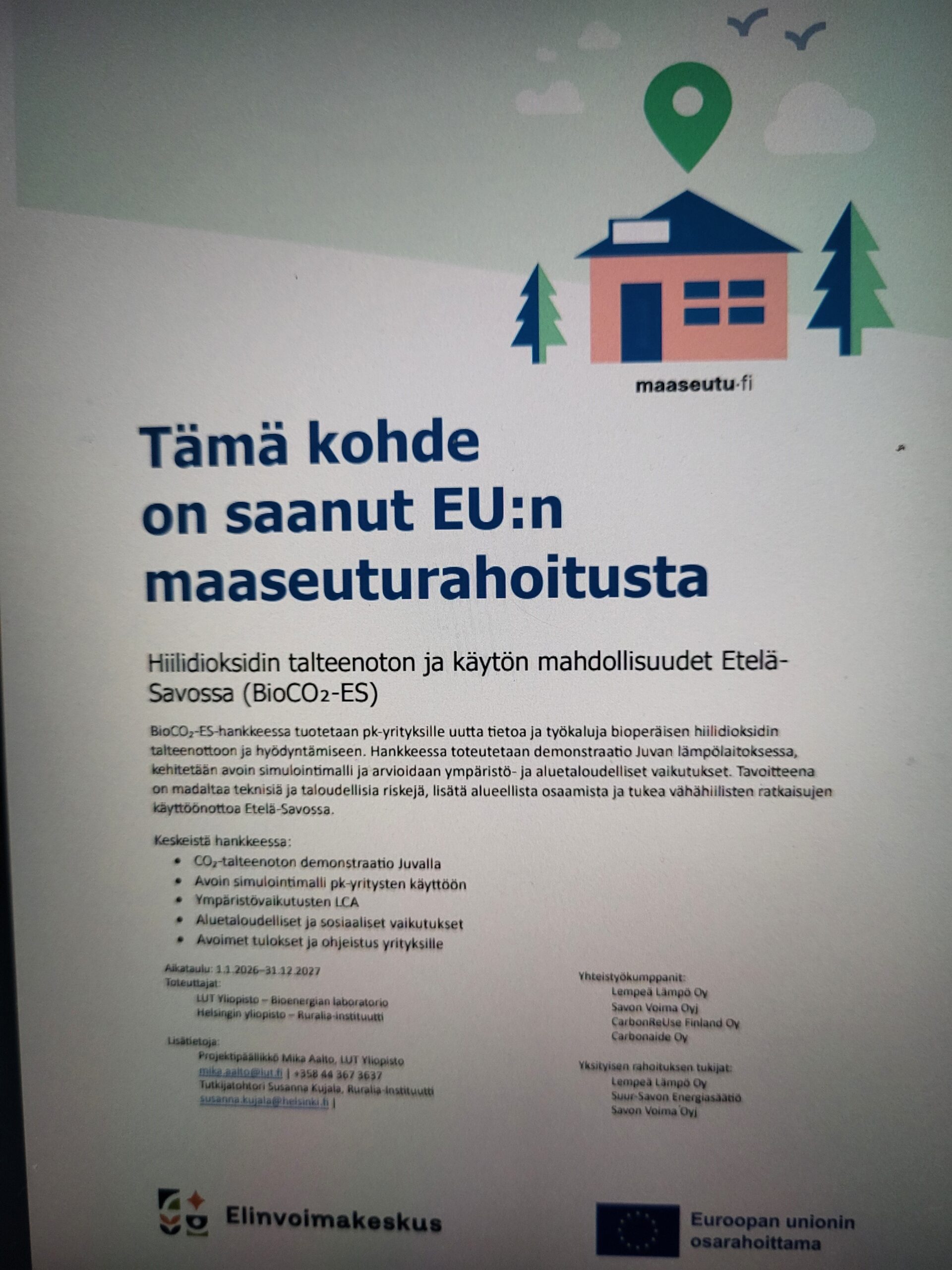 LUT‑yliopiston ja Helsingin yliopiston Ruralia‑instituutin yhteisessä Hiilidioksidin talteenoton ja käytön mahdollisuudet Etelä‑Savossa (BioCO₂‑ES) ‑hankkeessa tuotetaan uutta tietoa siitä, miten bioperäistä hiilidioksidia voidaan talteenottaa ja hyödyntää taloudellisesti, ympäristöllisesti ja alueellisesti kestävästi. Tavoitteena on tarjota käytännönläheistä tietoa Etelä‑Savon pk‑yrityksille.