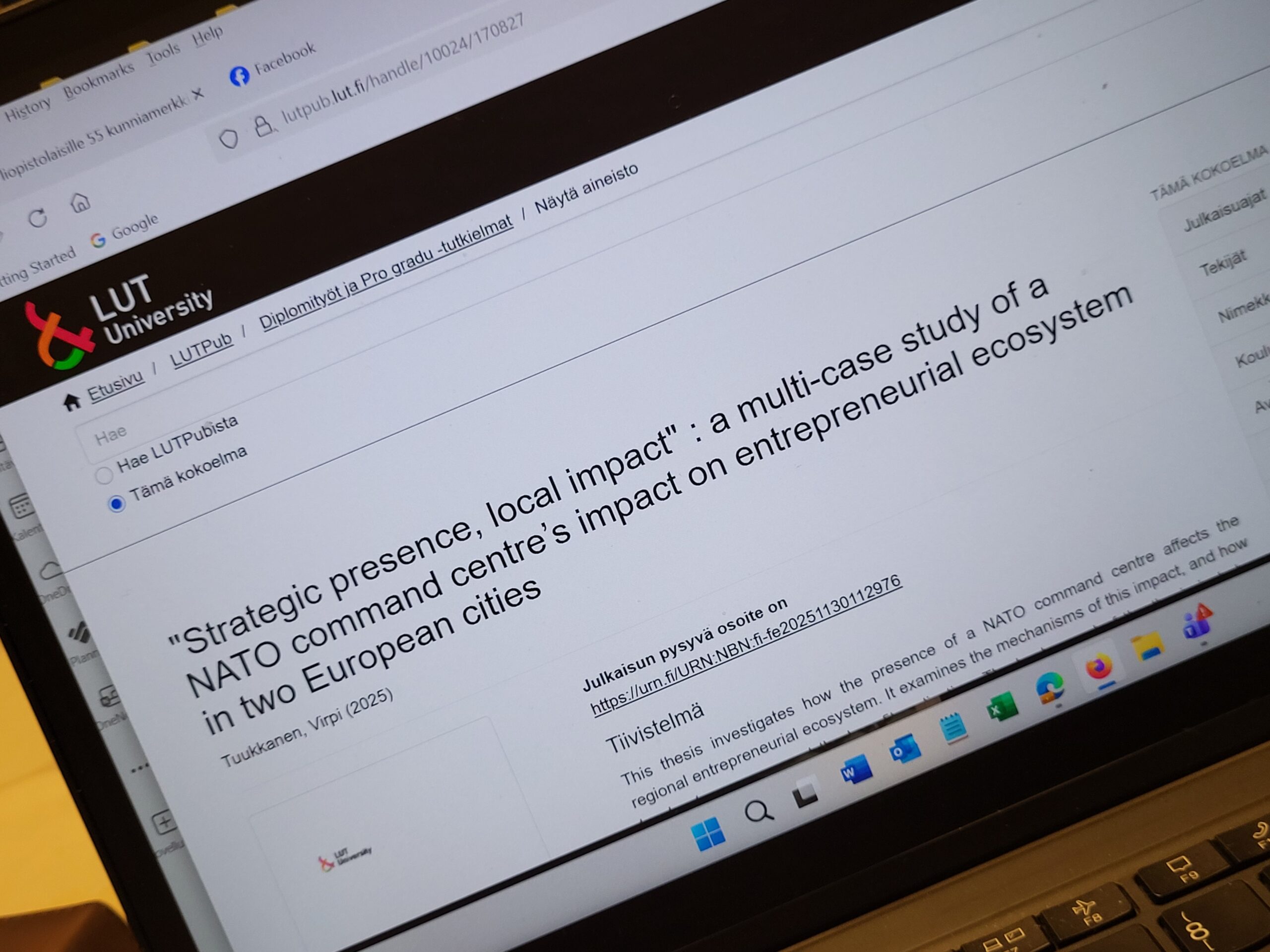 LUT-yliopiston opiskelija Virpi Tuukkanen tutki pro gradu -työssään, miten NATO-keskuksen läsnäolo vaikuttaa alueelliseen yrittäjyysekosysteemiin, millä mekanismeilla vaikutus tapahtuu, ja miten paikalliset toimijat voivat edistää hyötyjen realisoitumista.